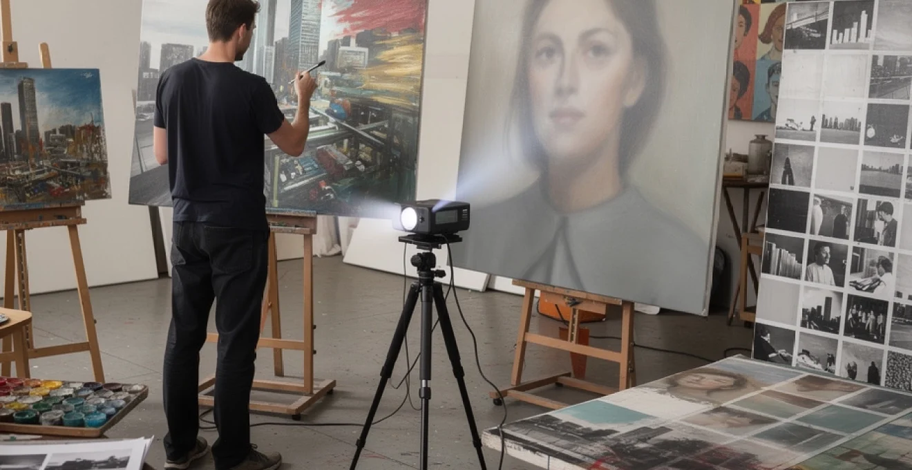 Les artistes peuvent modifier l’intensité lumineuse, l’angle de projection et la distance pour créer des effets visuels spécifiques. Cette flexibilité technique permet d’explorer différentes approches créatives et de développer un style personnel unique. Certains peintres utilisent la projection comme guide initial, tandis que d’autres l’intègrent directement dans le processus de création, superposant peinture et image projetée.
